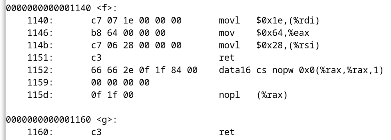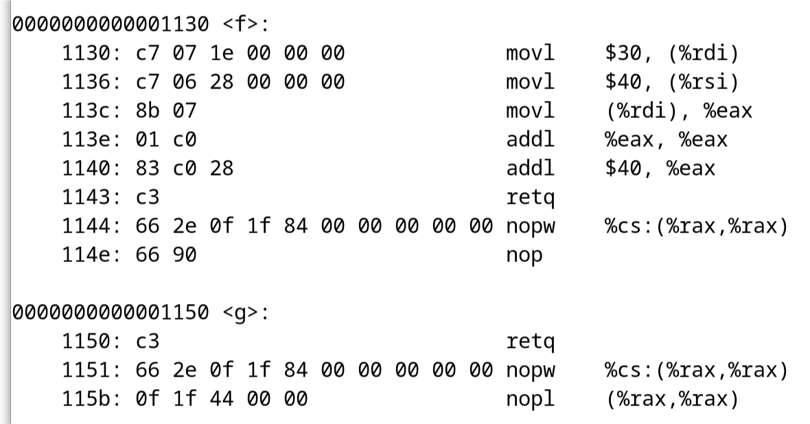 对比两次clang编译结果,第一次因为编译器无法确定(%rdi)和(%rsi)是否是重叠对象,此时(%rdi)可能为$30,也可能为$40,所以在第113c行需要再从(%rdi)取值,第1140行是否是重叠对象都不影响值为$40,因此直接使用立即数加入返回值。